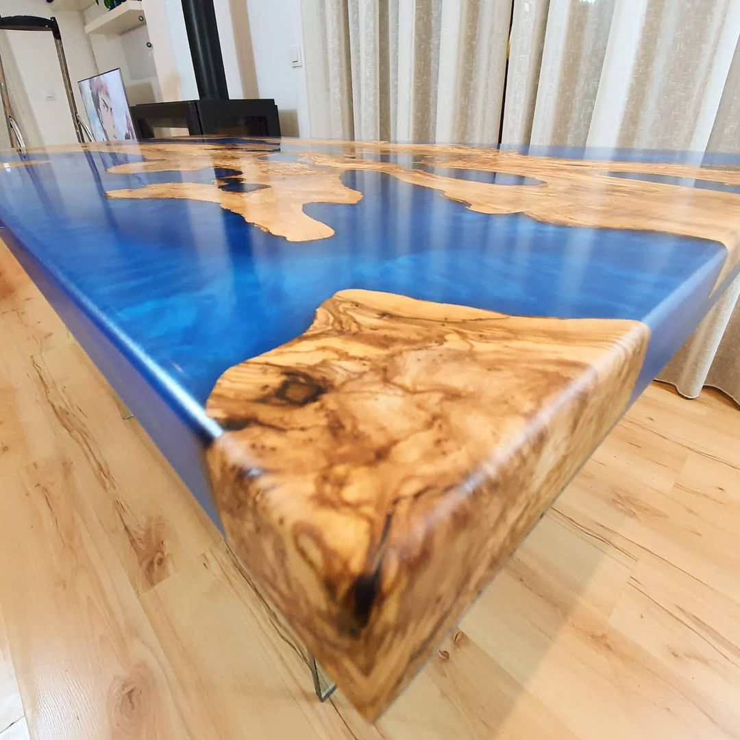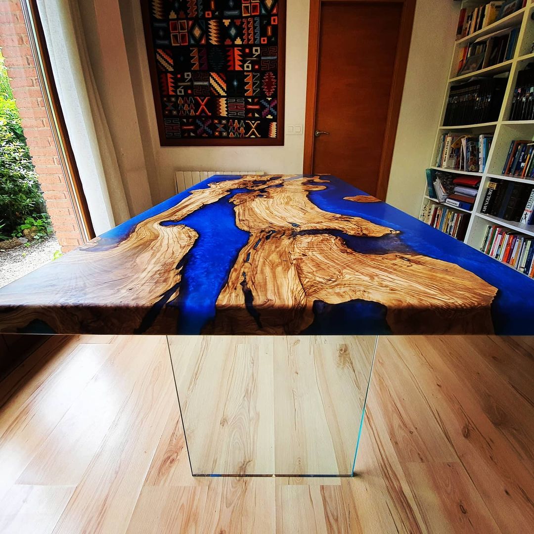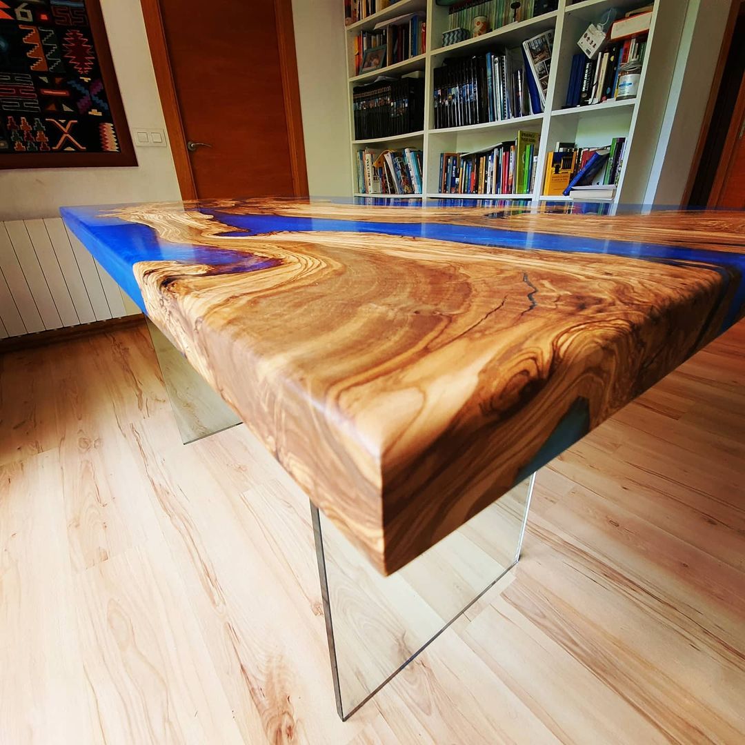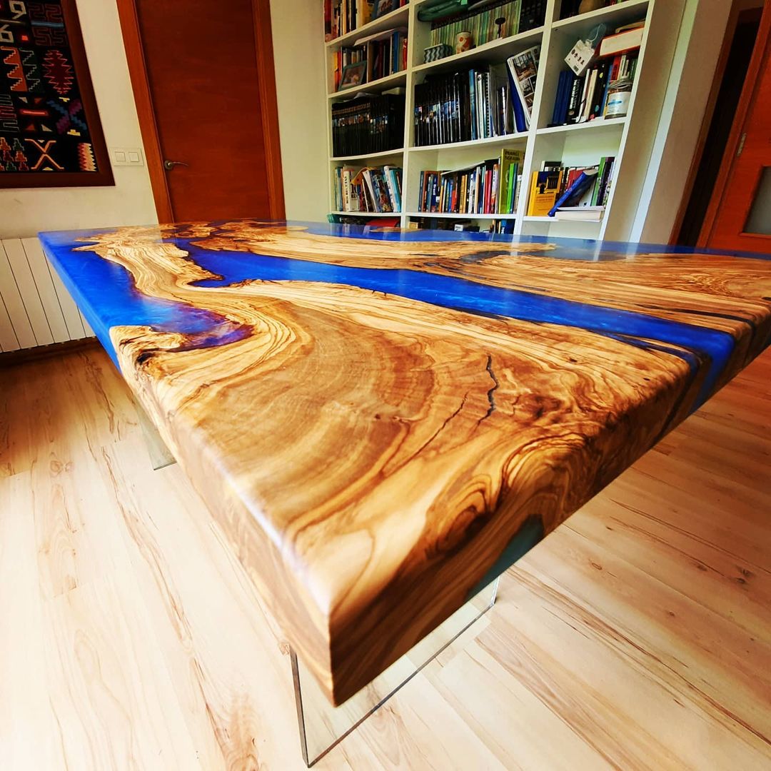 Mesa de río azul maciza fabricada con madera de olivo centenario
