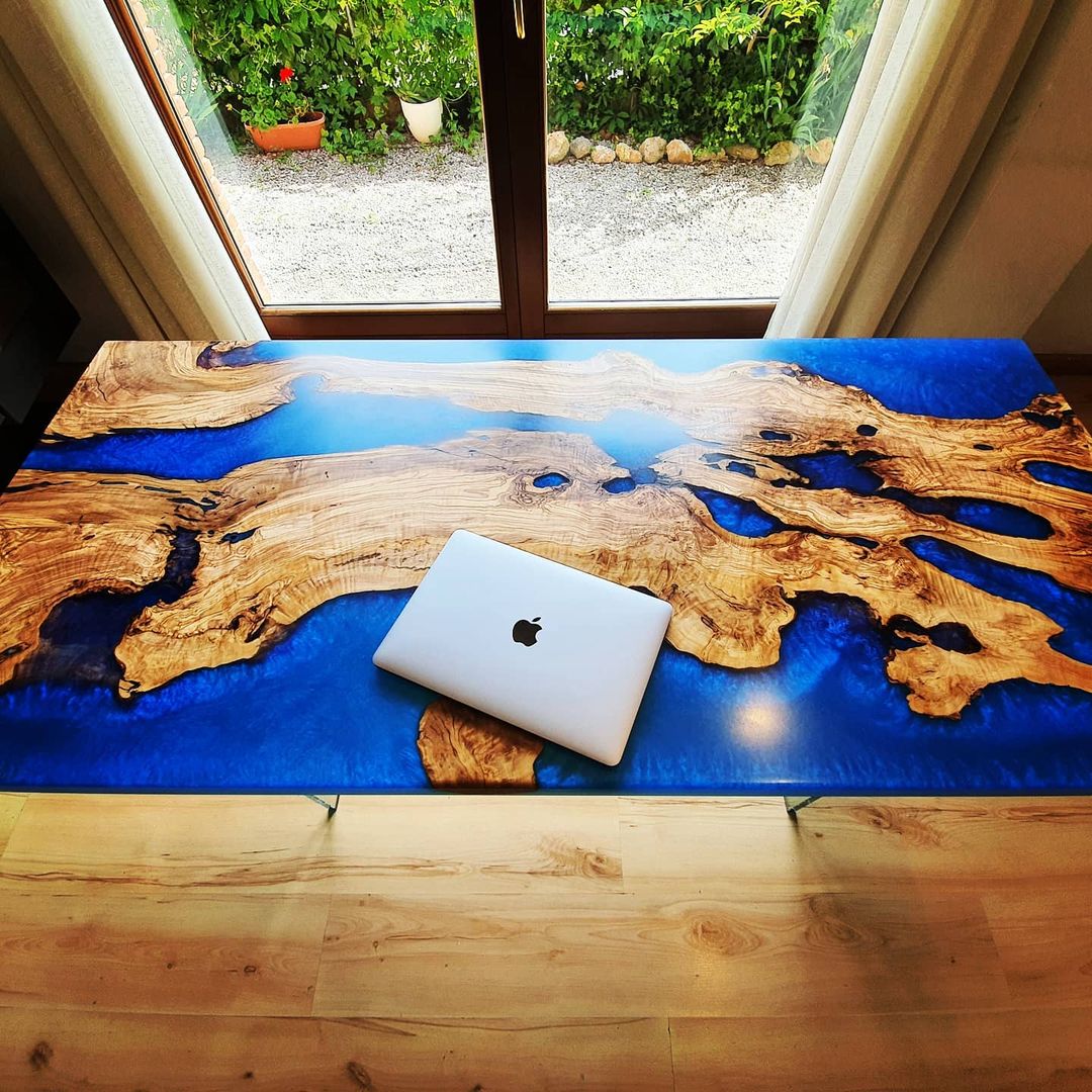 Mesa rectangular de escritorio en madera maciza centenaria de olivo con resina epoxi azul turquesa hecha para trabajar en su casa, oficina u hotel.