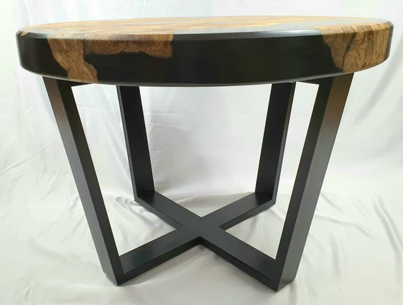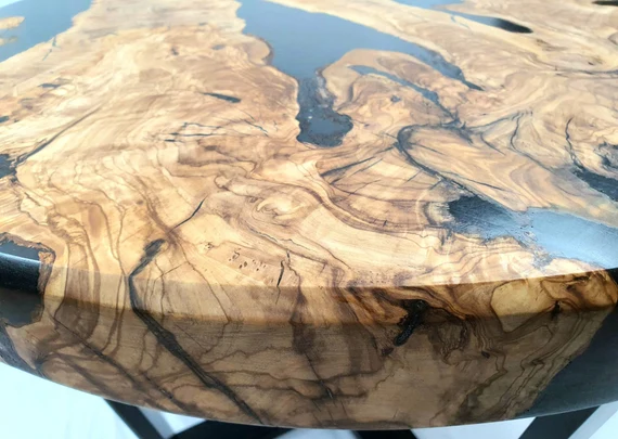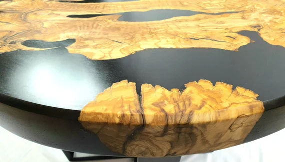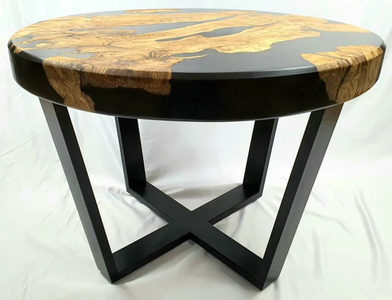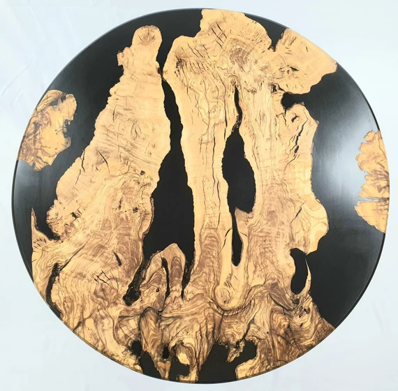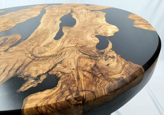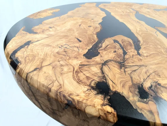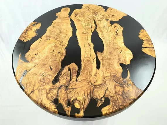 Mesa redonda de madera maciza centenaria de olivo con resina epoxi negra hecha para tomar café, té o para una mesa de café en una casa, oficina u hotel. Realizada con resina epoxi negra, mezclando la madera de olivo con la resina esta mesa es un placer para la vista.