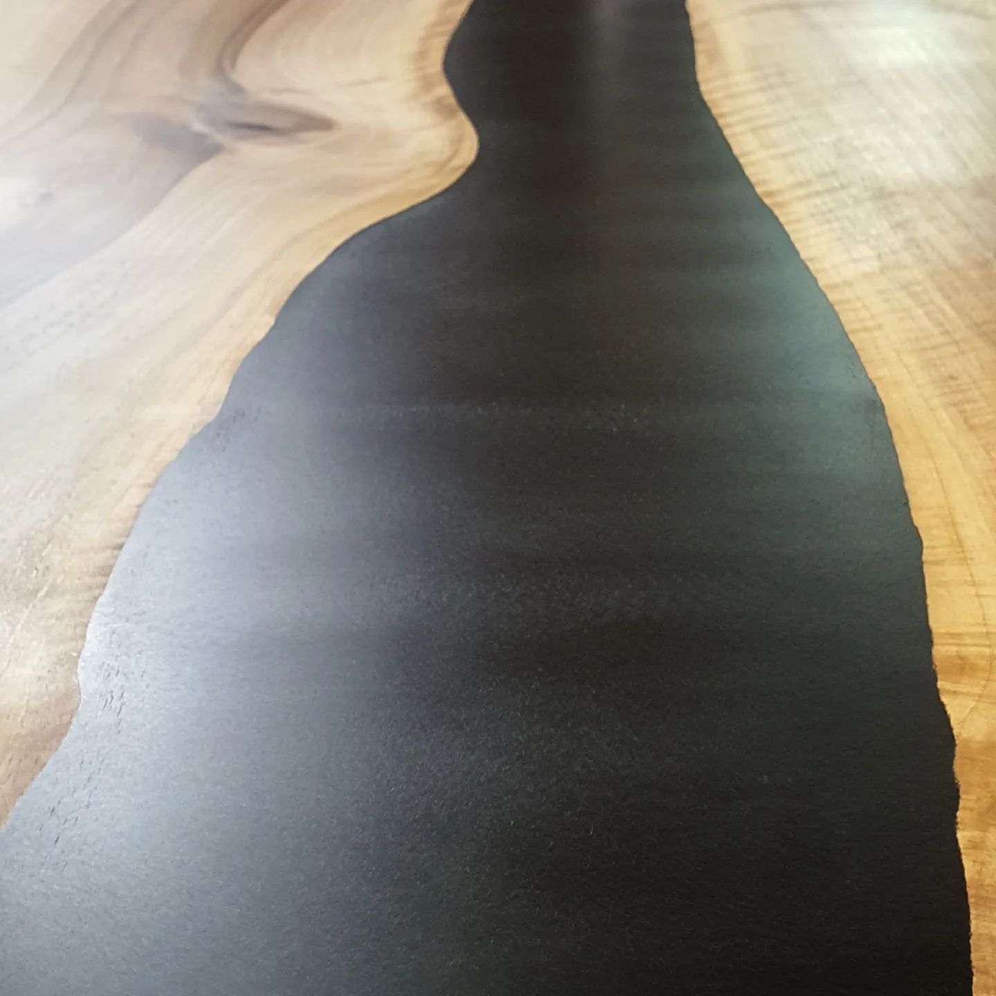 Esta mesa está fabricada en madera de Nogal Español con sus colores y vetas características, combinada con resina negra en el medio con un río que la atraviesa. La madera está recubierta con un barniz mate satinado que resalta los hermosos colores de la madera de Nogal.