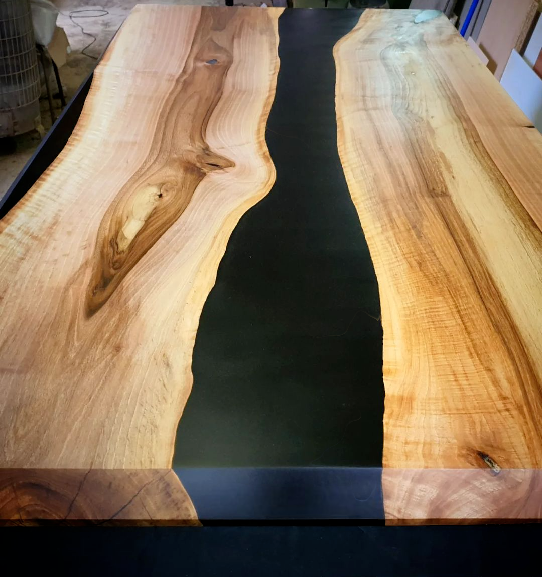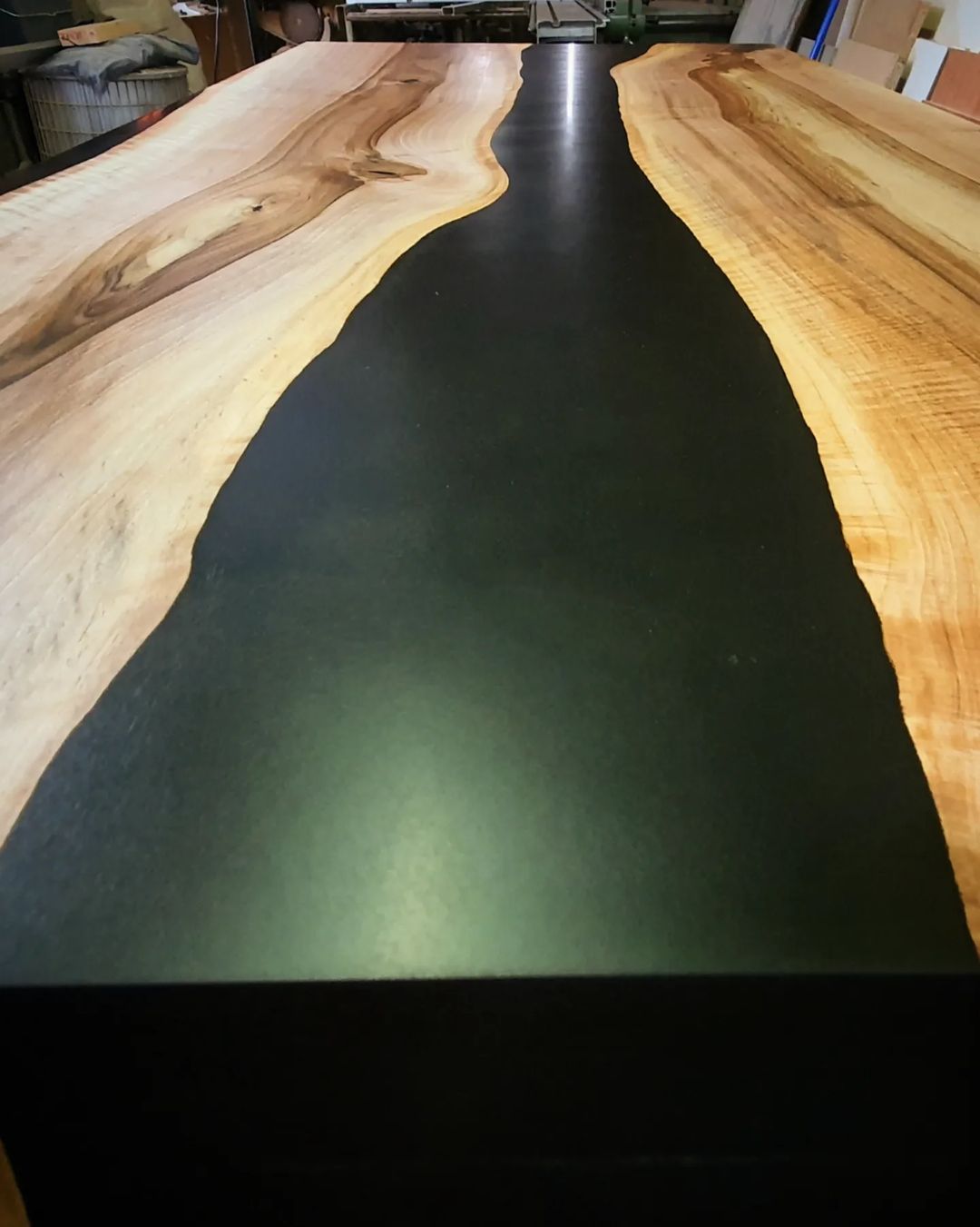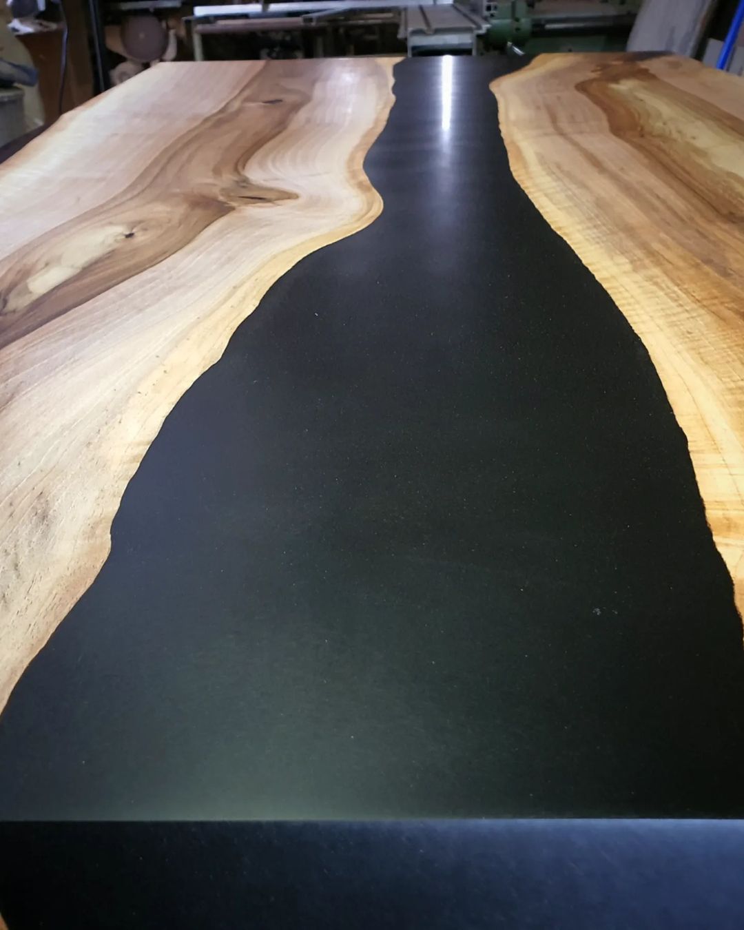 Mesa rectangular de escritorio en madera maciza centenaria de Nogal Español con rio «Epoxy» de color negro.