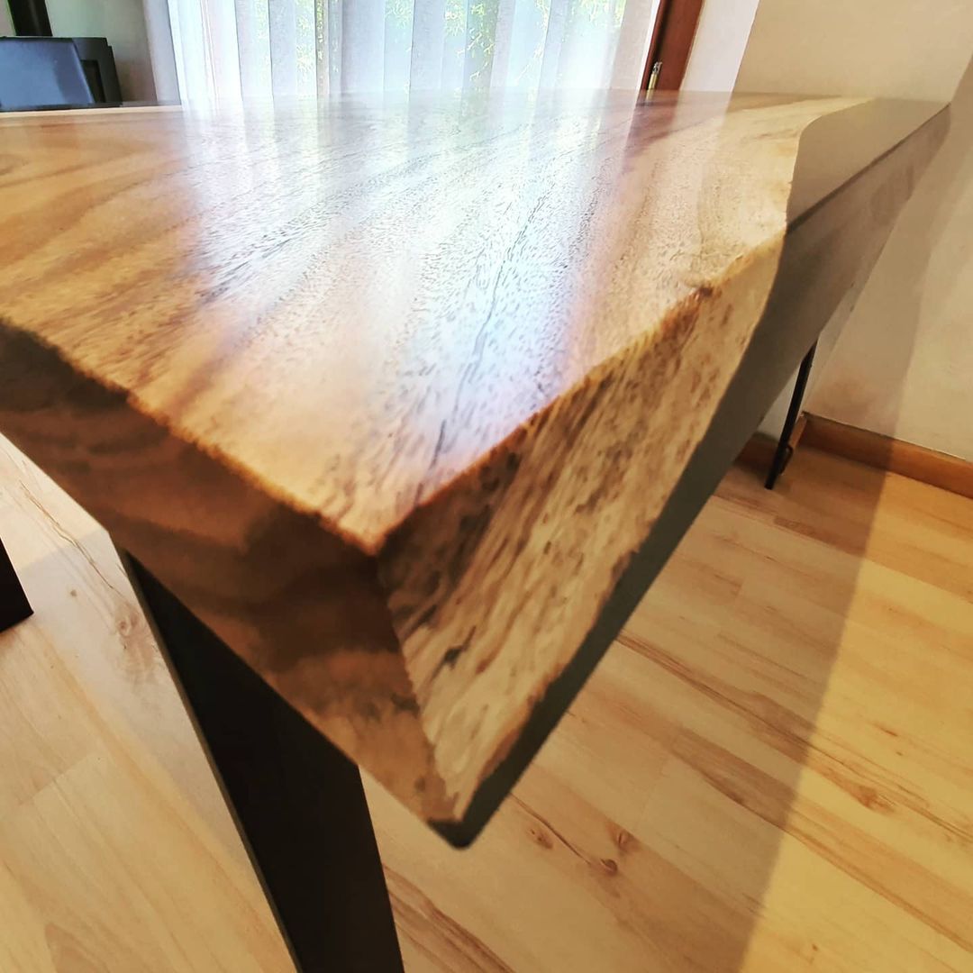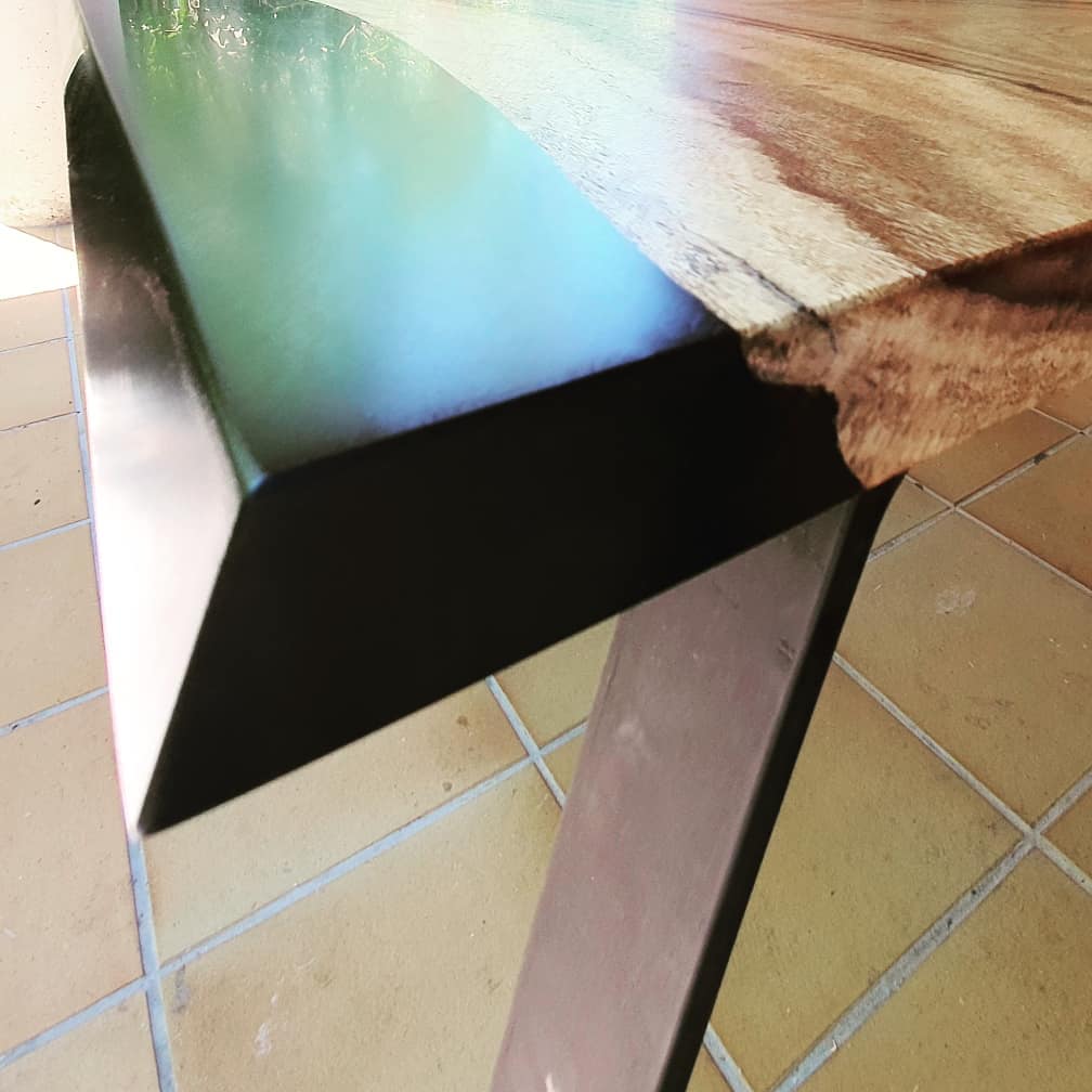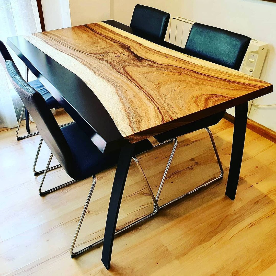 La mesa está realizada en madera Samanea Saman con sus característicos colores y vetas. La madera está recubierta con un barniz mate satinado que resalta los hermosos colores de la madera de samanea. La mesa destaca por los bordes naturales vainilla de la madera ámbar. Se apoya en 4 patas de acero forjado negras.